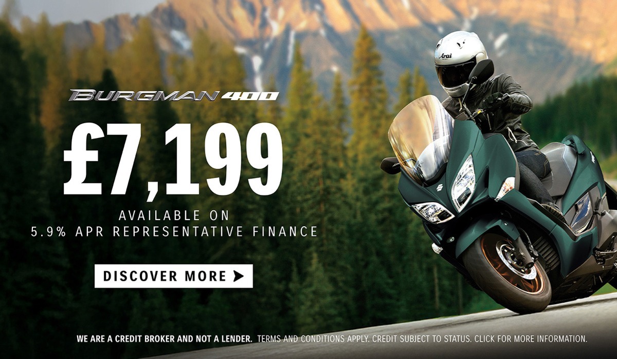 PCP Finance offer applies to the purchase of a new Burgman 400 only from a participating Suzuki Dealership. The motorcycle must be purchased and registered between 01/04/2026 and 30/06/2026 to qualify for the offer. £1,000 minimum deposit required. Credit subject to status, UK residents aged 18+. Suzuki Financial Services Ltd, St.William House, Tresillian Terrace, Cardiff, CF10 5BH. ?Finance figures applicable at time of print and are subject to change. Representative Example is based upon an annual mileage of 4,000 miles per annum.? With PCP, once you have paid all of the regular monthly repayments you have the option to: 1. Return the motorcycle and not pay the Optional Final Repayment. In this example if the vehicle has exceeded 12,333 miles, a charge per excess mile will apply of 6p plus VAT will apply per excess mile. If the motorcycle is in good condition (fair wear and tear accepted) and has not exceeded the maximum agreed mileage, you will have nothing further to pay, 2. Pay the Optional Final Repayment to own the motorcycle, or 3. Part exchange the motorcycle subject to settlement of your existing credit agreement; new credit agreements are subject to status.?